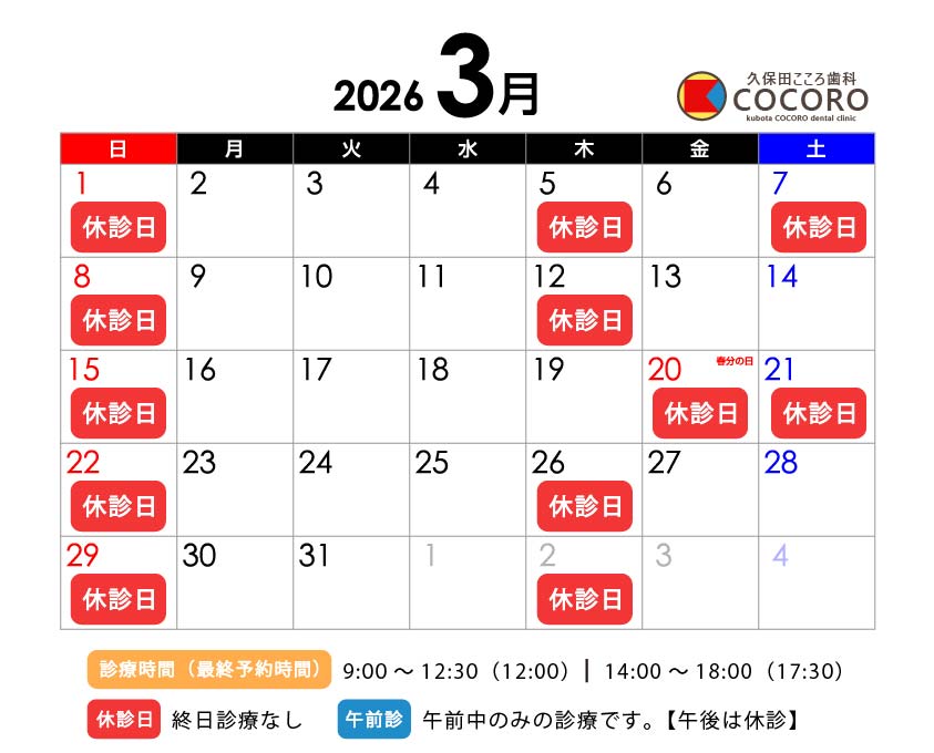 3月は、7日(土)・20日(日)・21日(土)および毎週日曜・木曜を休診とさせていただきます。